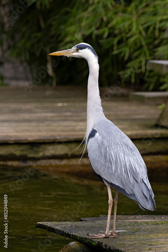 © photoPepp, Naklejka premium A blue heron stands on a wooden dock by the water.