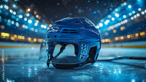 © Siasart, Obraz premium A blue hockey helmet on ice, illuminated by arena lights.