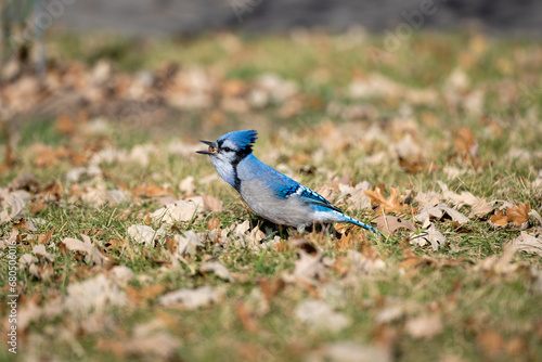 Obraz premium A Blue jay foraging on dried leaves grass.