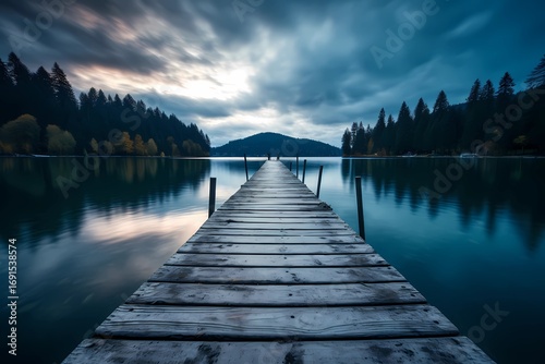 © Tari, Fototapeta premium A blue lake with a wooden dock