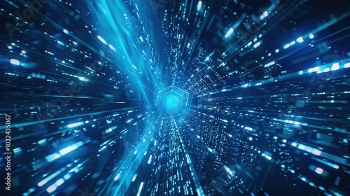 © aref, Fototapeta premium A blue lighted tunnel with a bright light at the end