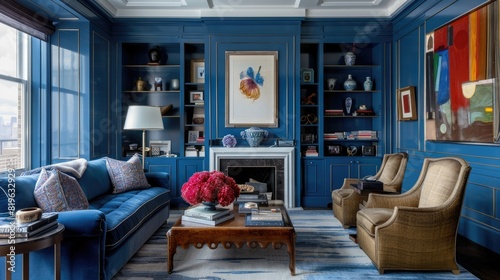 © At My Hat, Naklejka premium A blue living room with a fireplace, a couch, and two chairs. The room is decorated with a blue color theme and has a modern design