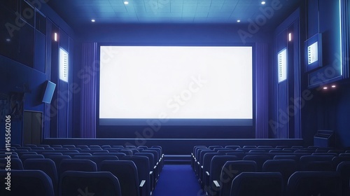 © Resad, Fototapeta premium A blue movie theater with vacant chairs and a white blank screen. idea of pleasure, relaxation, and a movie theater.