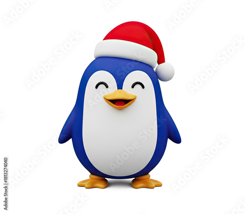 © Sim, Obraz premium A blue penguin wearing a red Santa hat, standing on a png transparent.