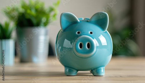Fototapeta premium A blue piggy bank sits on a wooden table