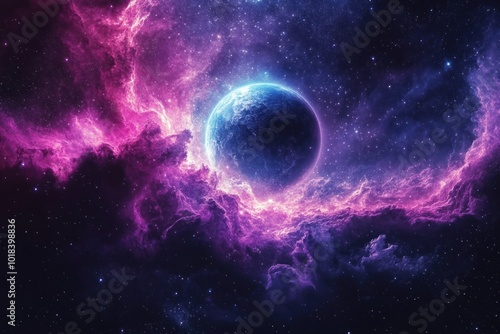 © Umi Sakina, Obraz premium A blue planet in a nebula, surrounded by pink and purple clouds.