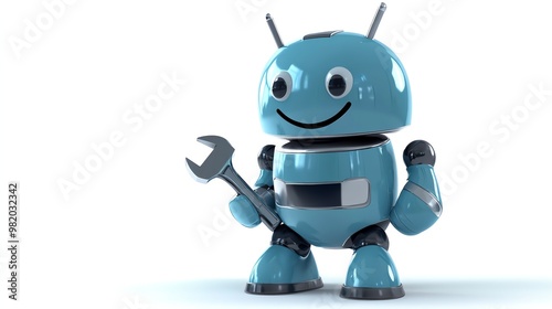 Naklejka premium A blue robot holds up a wrench with a smile on its face.