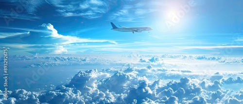© Nathamanee, Fototapeta premium A blue sky with a plane flying through it