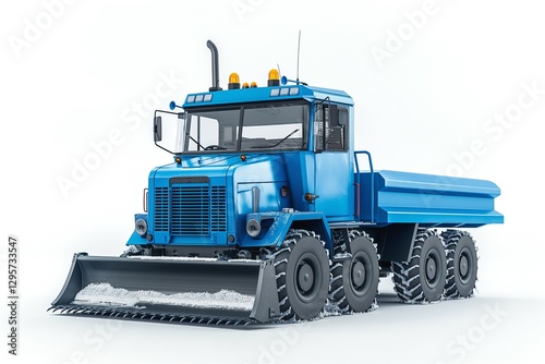 © imagemir, Naklejka premium A blue snowplow truck with large tires and a front blade, ready for winter road conditions.