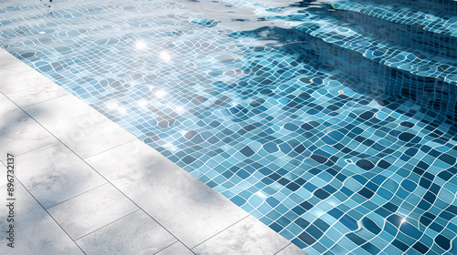 Obraz premium A blue tiled swimming pool with rippling water and a light grey tiled edge, background