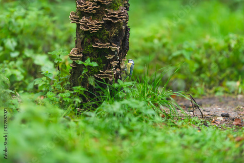 © ysbrandcosijn, Obraz premium A blue tit on a mossy tree trunk.