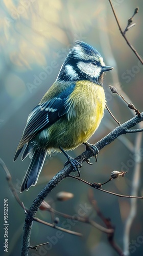 Fototapeta premium A blue tit perched on a branch with soft light.