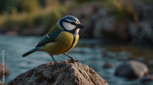 © Zeva, Obraz premium A blue tit perched on a rock by a river, with a blurred background of water and green foliage.