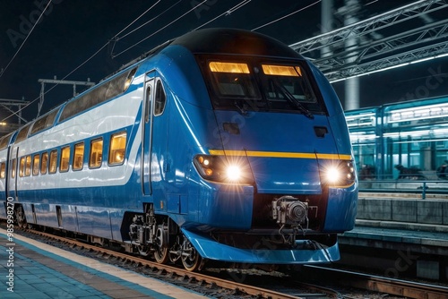 © polack, Fototapeta premium A blue train is moving down the tracks at night. The train is long and has many windows