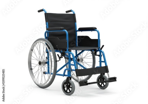 © Vooglo.com, Fototapeta premium A blue wheelchair with black fabric seat and backrest on a white background in a studio shot view