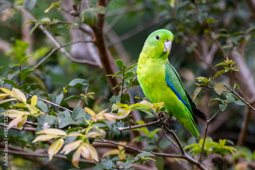 © Fernando Calmon, Obraz premium A Blue-winged Parrotlet also know as Tuim perched on branch. Species Forpus xanthopterygius. Animal world. Bird lover. Birdwatching. Birding. The smallest parrot in Brazil.