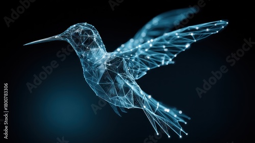 Fototapeta premium A blue, wireframe hummingbird with glowing eyes and wings, flying against a...