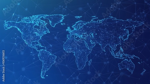 Fototapeta premium A blue, wireframe world map displays global interconnectedness.