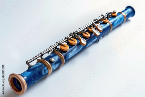 Naklejka premium A blue wooden flute with metal keys, designed for musical performance. on...