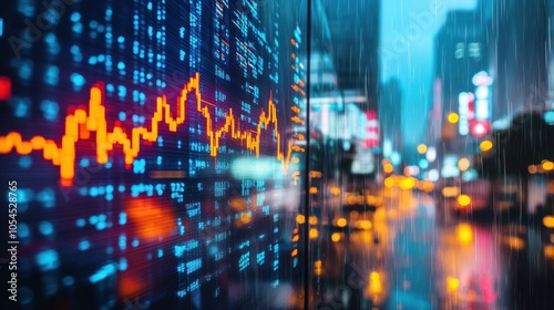 © wisnuromad art, Obraz premium A blurred cityscape with a digital stock market graph overlay during rain.