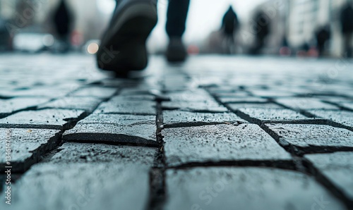 Fototapeta premium A blurred figure walks on the wet cobblestones, creating a sense of movement and urban exploration.