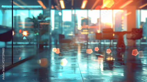 © rizkan, Naklejka premium A blurred interior view showcasing modern architecture and cityscape reflections.