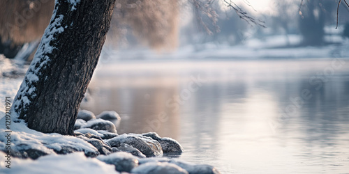 © El Media, Fototapeta premium A blurred photograph of an icy lake in winter, with snow-covered rocks and trees on the shore.