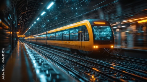 Naklejka premium A blurred train in a dimly lit station, suggesting motion and speed.