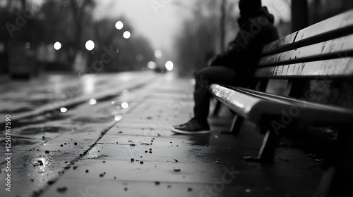 © Generative AI, Obraz premium A blurred view of a person sitting alone on a park bench during a rainy day capturing an atmosphere of solitude : Generative AI