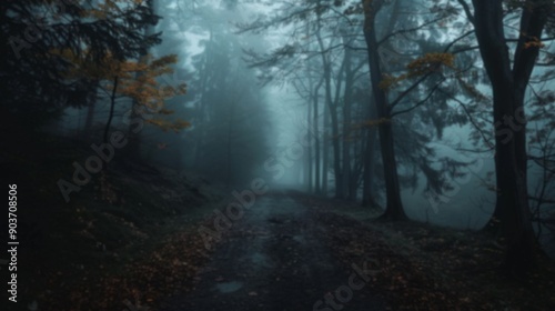 Naklejka premium A blurred view of a serene forest pathway enveloped in morning fog and...