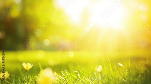 Obraz premium A blurred view of grass illuminated by sunlight creates a serene spring background, featuring a green meadow with a bokeh effect and ample space for text.