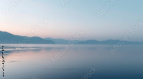 © Poindexter, Fototapeta premium A blurry landscape with mountains and a lake possibly at dusk or dawn