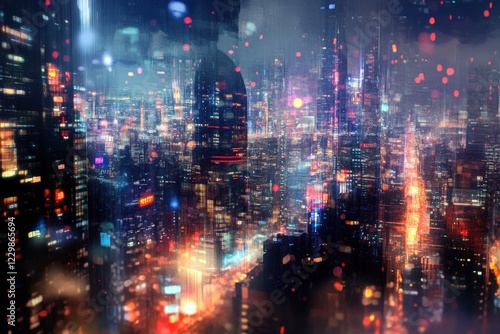 © Alexei, Fototapeta premium A blurry night photo of a busy city street with bright lights