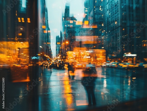 © Kuo, Naklejka premium A blurry, out-of-focus photograph taken from inside a window on an overcast day in New York City, with reflections and double exposure of people walking down busy streets surrounded by tall buildings.