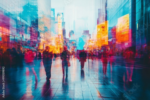 © Cloudyew, Obraz premium A blurry photo of a busy city street with people walking and cars driving