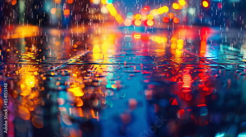© Sutthi, Fototapeta premium A blurry photo of a city street at night. Rain creates a reflective puddle on the street