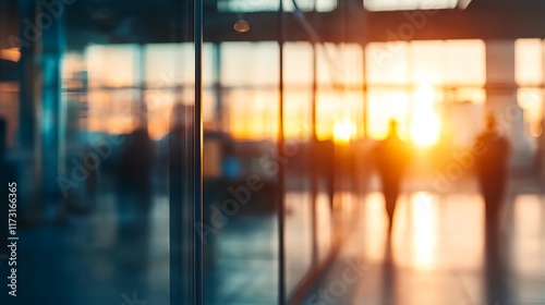 © progressman, Fototapeta premium a blurry photo of people walking in a building at sunset