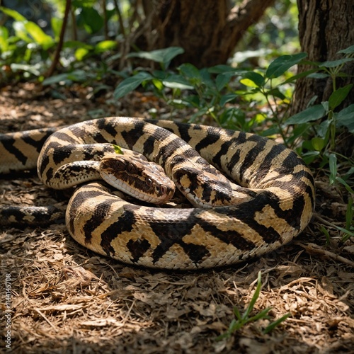 © Javed, Fototapeta premium A boa constrictor basking under dappled sunlight on a tree.