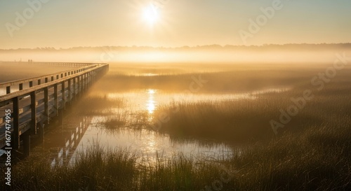 © musgraphy, Obraz premium A boardwalk through a marsh at sunrise with fog and golden light