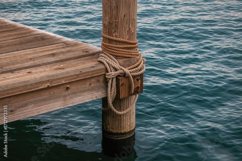 Fototapeta premium A boat dock corner with ropes coiled around posts by the lake.