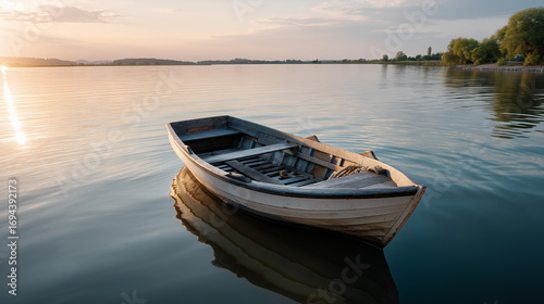 Naklejka premium A boat floats at sunrise, the peaceful scene illuminated by gentle sunlight....