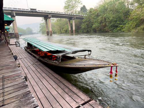 © schankz, Fototapeta premium A boat is docked at a pier with a bridge in the background