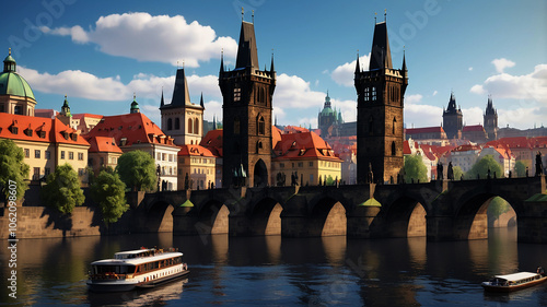 © Ashik, Fototapeta premium A boat is sailing down a river with a bridge in the background.