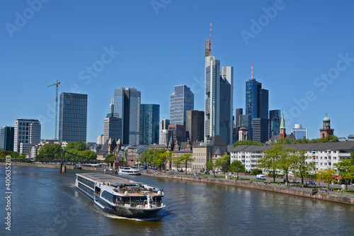 © Boris, Fototapeta premium A boat on the river Main in the background the skyline of Frankfurt on Main, in Germany