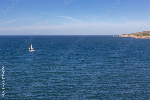 © Panpiki, Obraz premium A boat sailing away from the coast