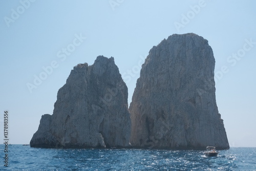 Fototapeta premium A boat sails in front of the iconic rock arch in Capri, Italy, with towering...