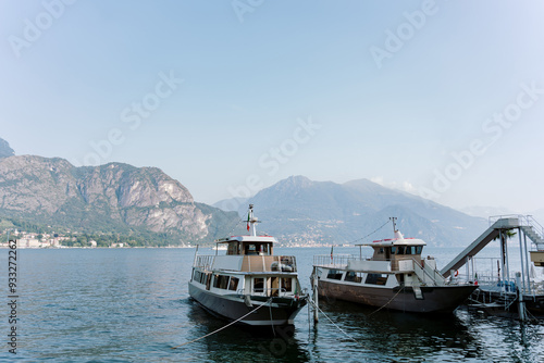 © Luscene, Fototapeta premium A boat sails on a mountain lake in Italy