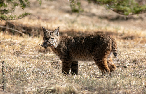© Gary Peplow, Obraz premium A Bobcat in the Dry California Hills Hunting for food and Catching a Ground Mole still Holding it in its Mouth and Looking at the Camera