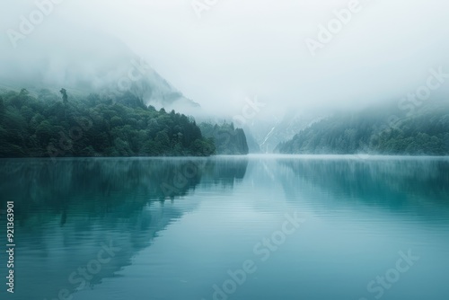 Fototapeta premium A body of water enveloped by trees with mist floating above its surface, Mist dancing above the glassy surface of a tranquil lake