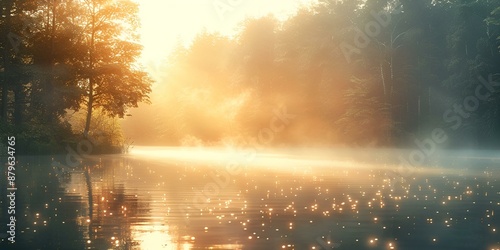 © Hassan, Naklejka premium a body of water surrounded by trees and fog.